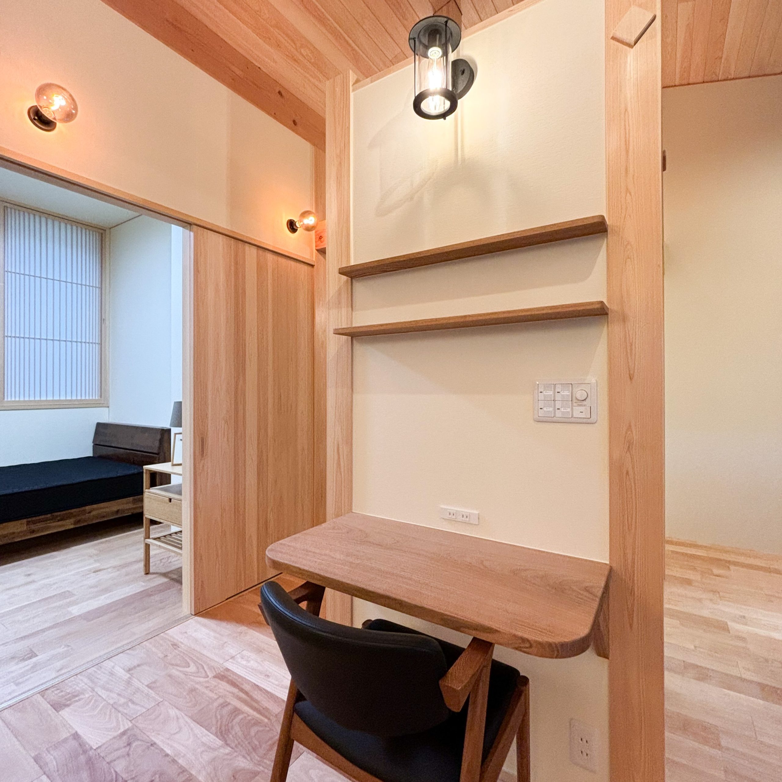 使い勝手の良いワークスペース。奥にはすっきりとコンパクトな寝室。造作の建具も見どころ。