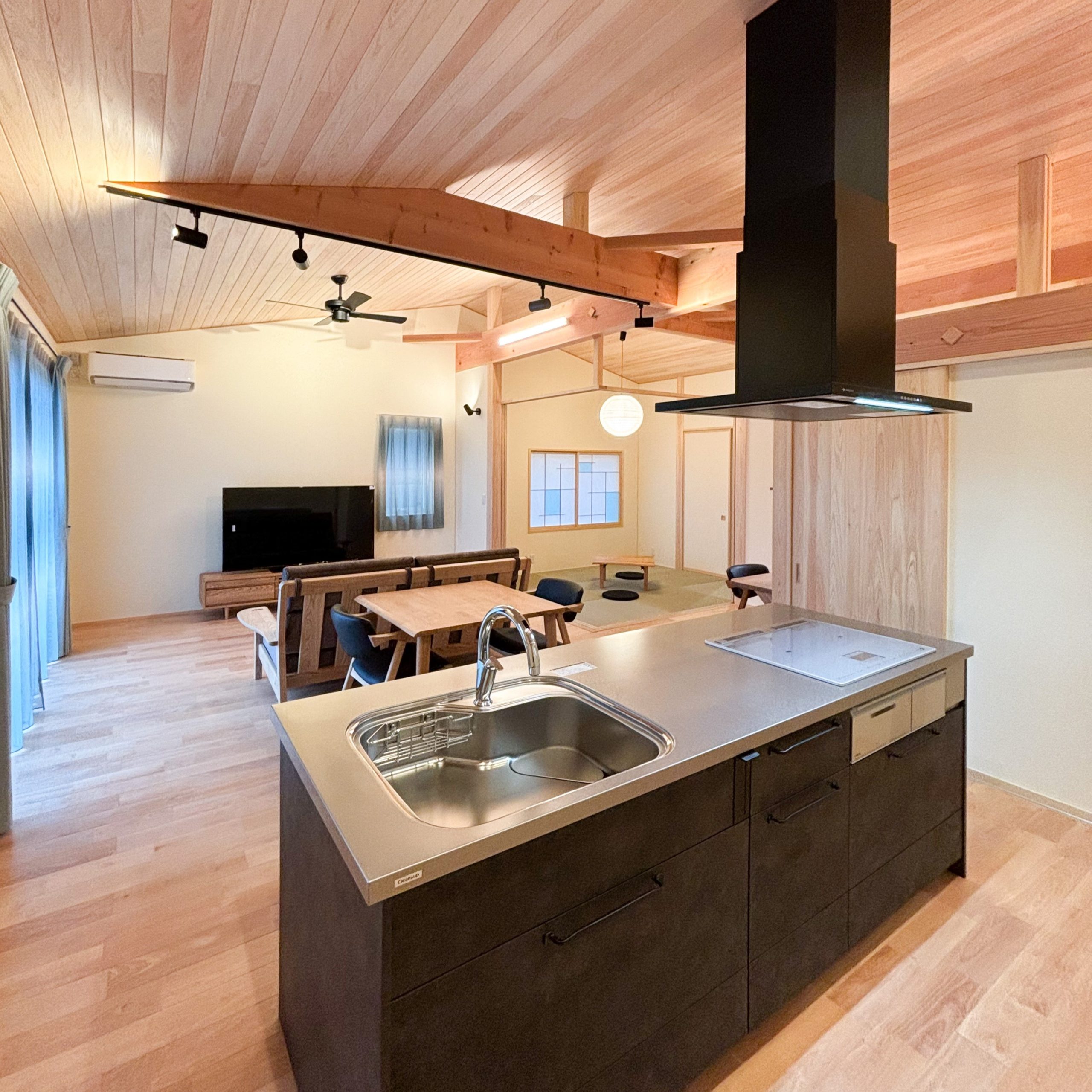 完成したお住まいは、快適に、そして健康的に毎日を過ごせる木の香りに包まれたとても開放的な平屋。
