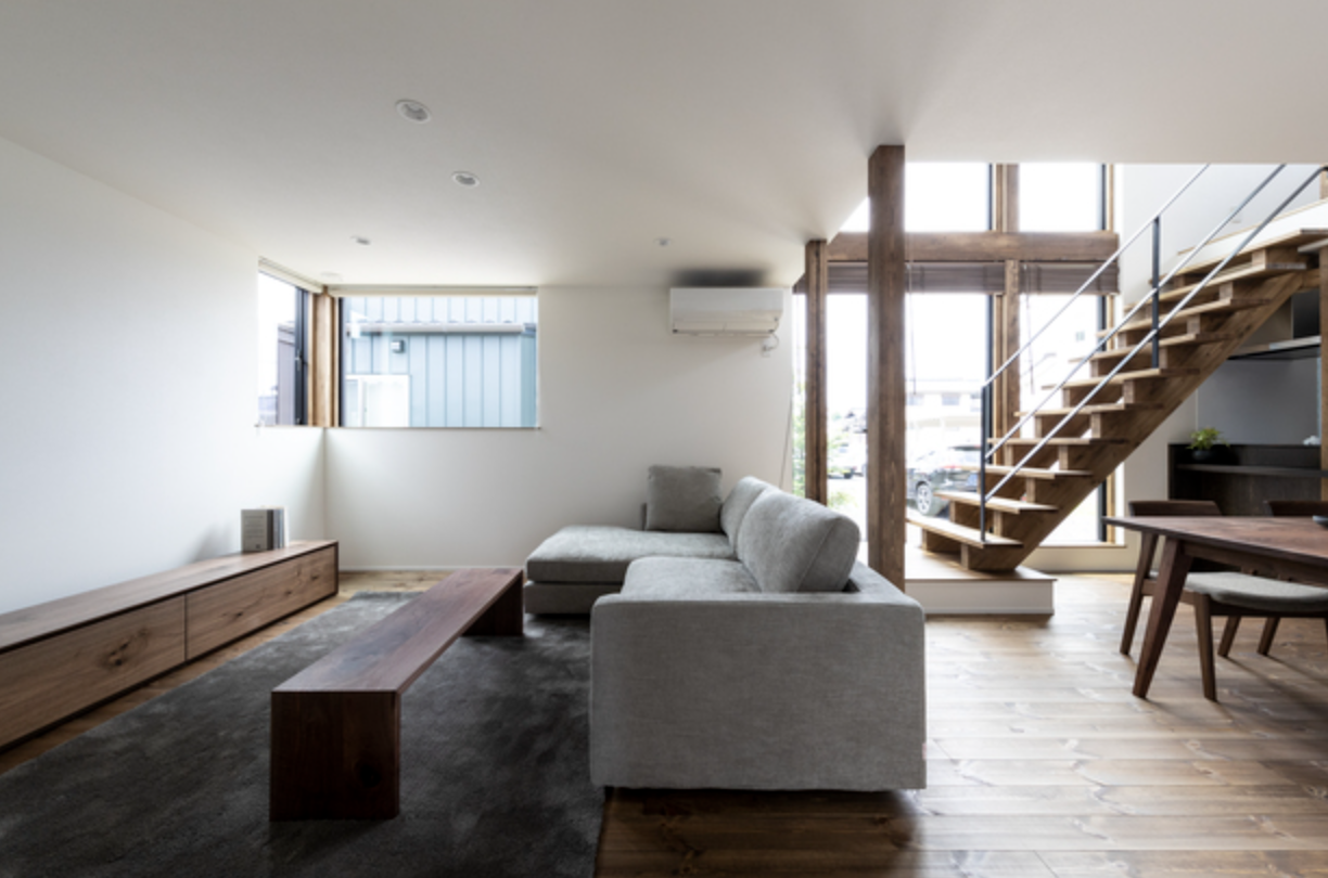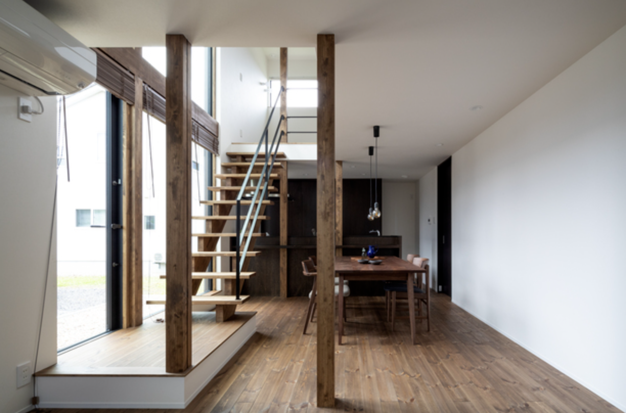 【20帖の広々としたLDK】スケルトン階段と吹き抜けデザインにすることで、空間に広がりが生まれ、開放感を感じられる20帖のLDK。 木のあたたかさをふんだんに感じることができる造作家具や 大きな窓から明かりを取り入れられるLDKは、家族が集まる場所として最適です。