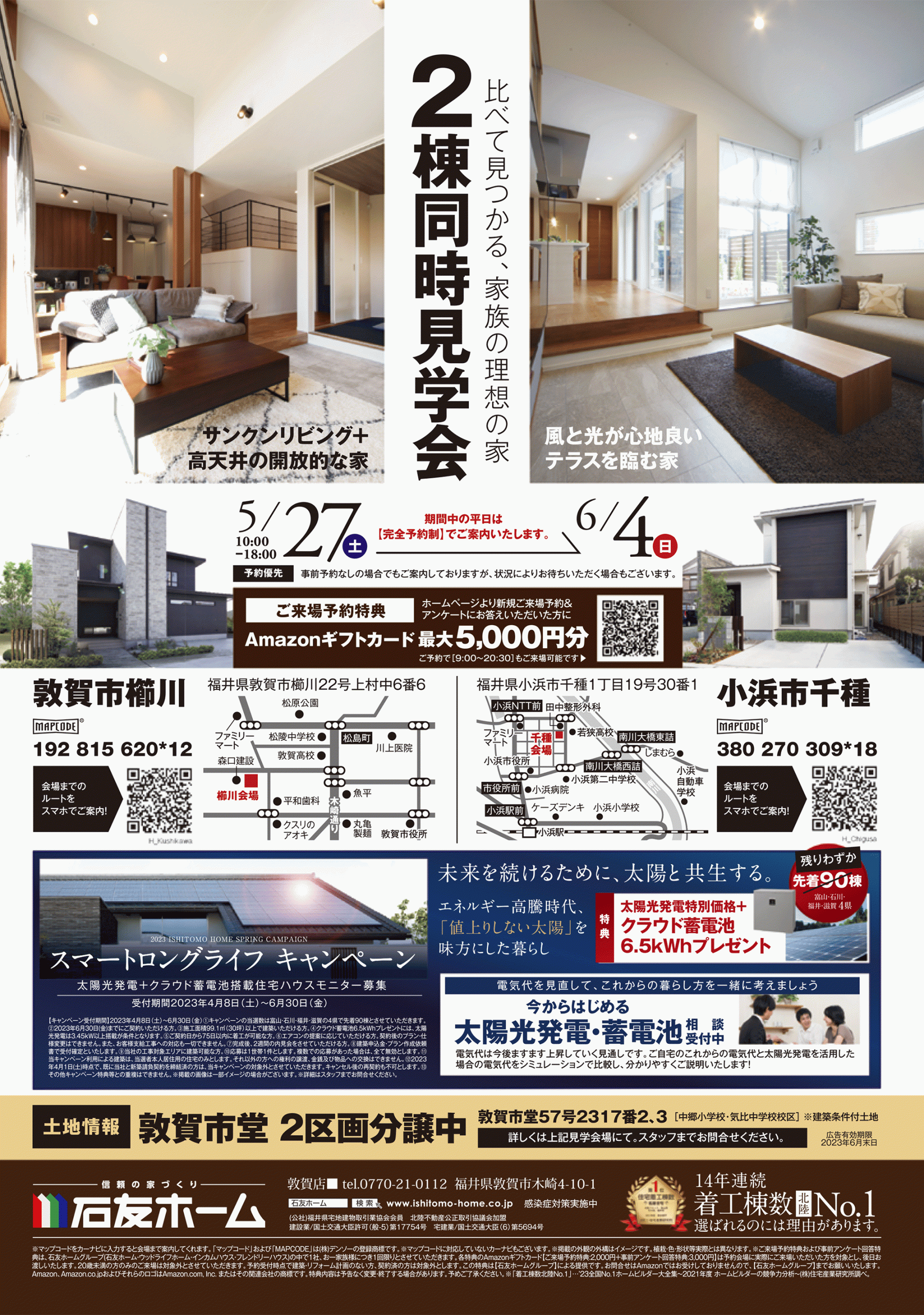 5/27(土)~6/4(日)まで敦賀市櫛川・小浜市千種にて2棟同時見学会を開催いたします!