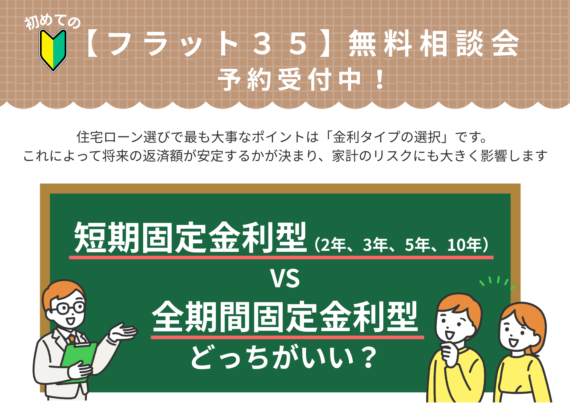 短期固定金利型(2年、3年、5年、10年)VS全期間固定金利型【フラット35】。