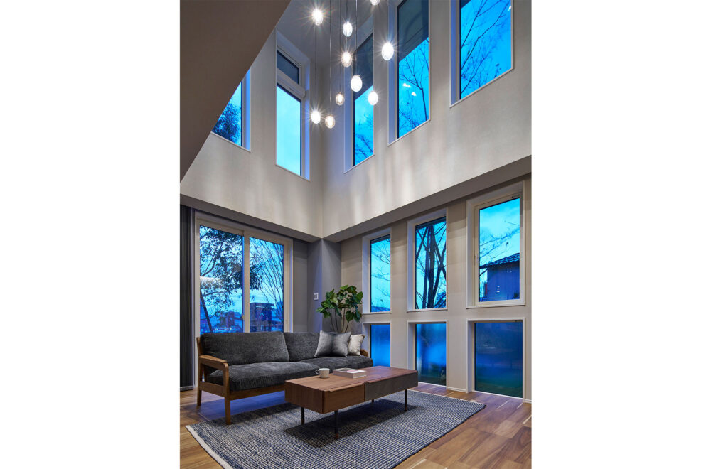 夜には吹抜け上部のペンダント照明が柔らかく灯り、