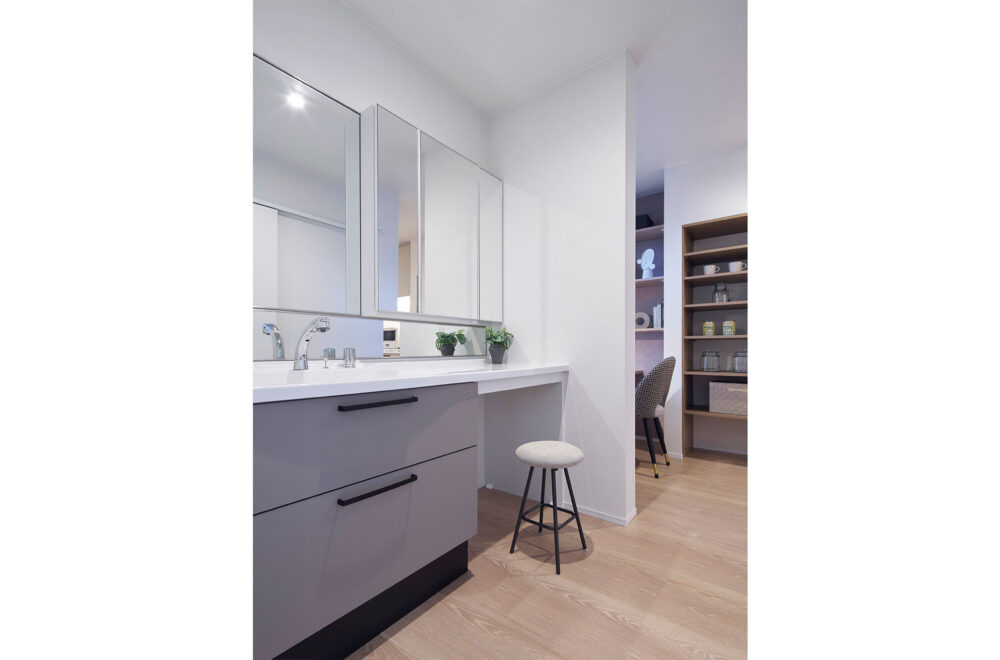 洗面から脱衣、サンルームまでを一直線につなぐことで、