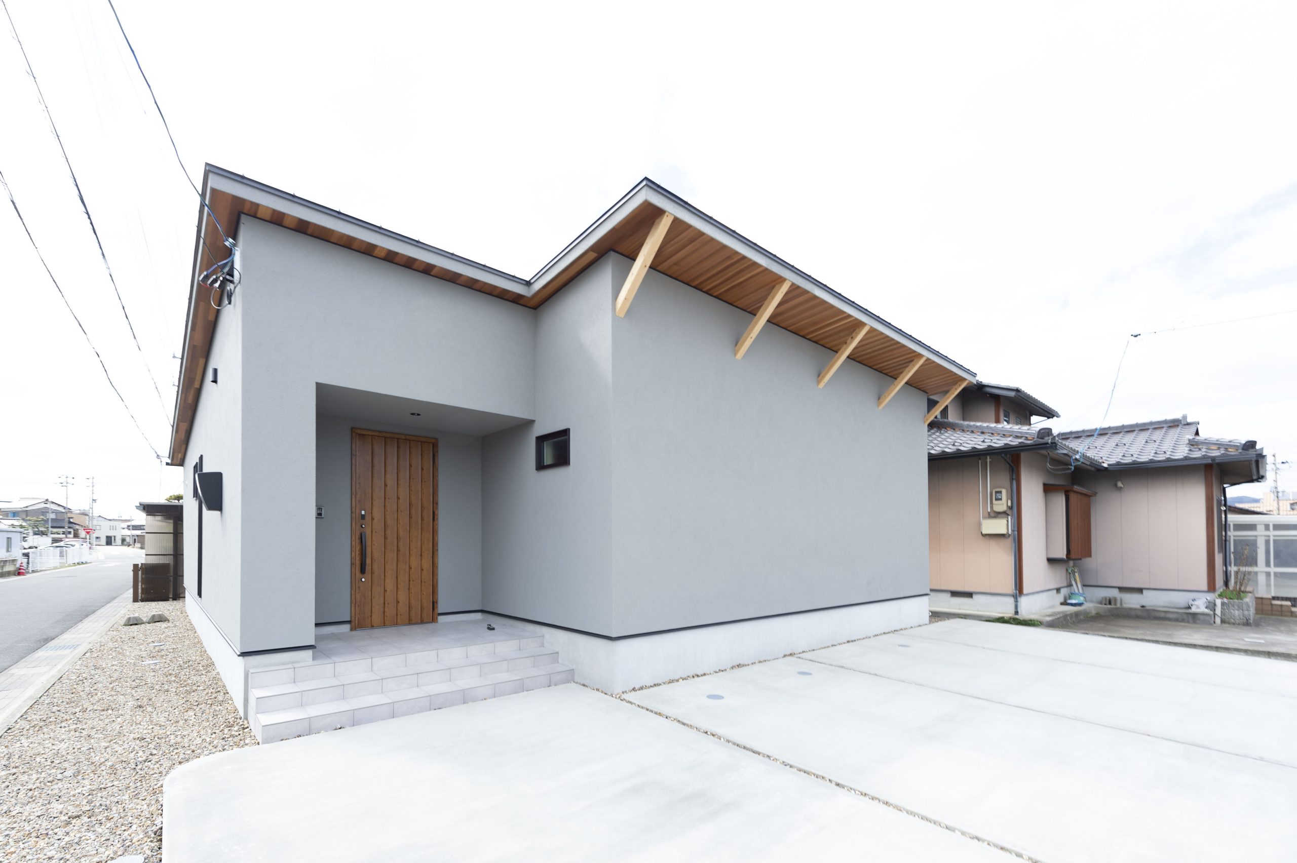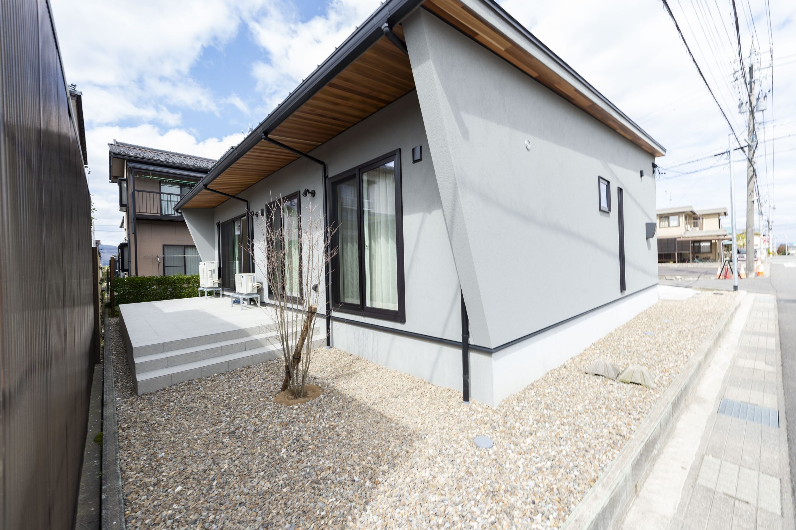 グレー×木のアクセントでスタイリッシュなデザインの外観