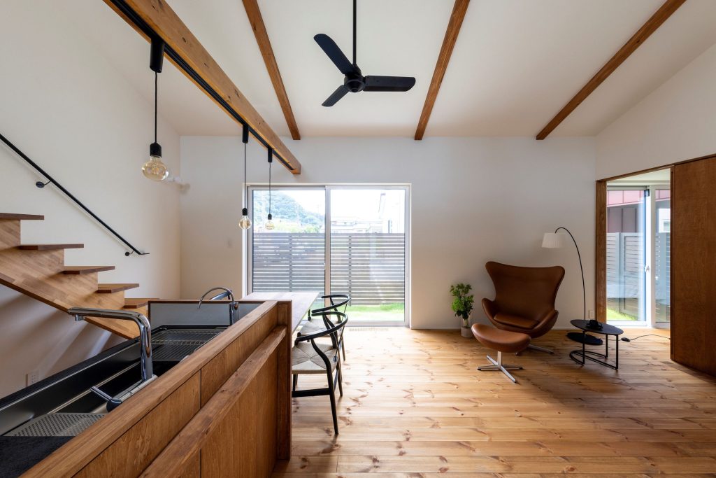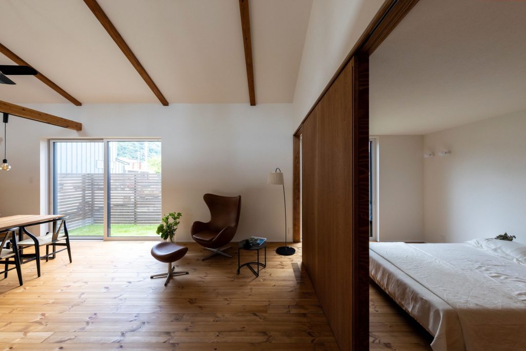 LDKと寝室が引き戸を通じてフラットにつながる、大きなワンルーム空間。(平屋の家)