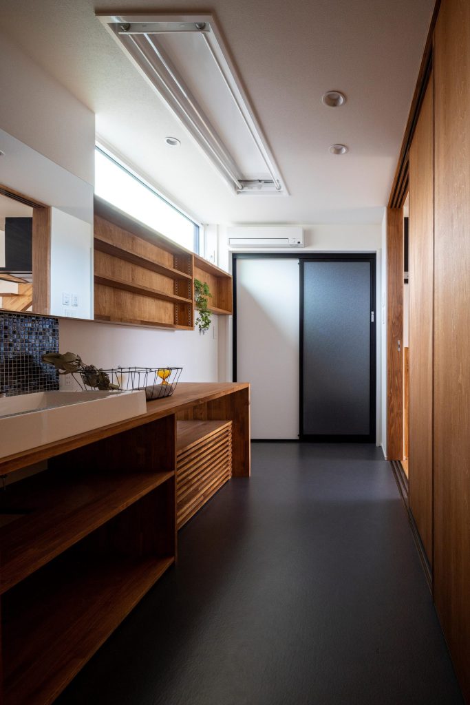 LDKから最短で、洗面・ランドリー・サンルームへ。「暮らしがラクになる」家事動線。(平屋の家)