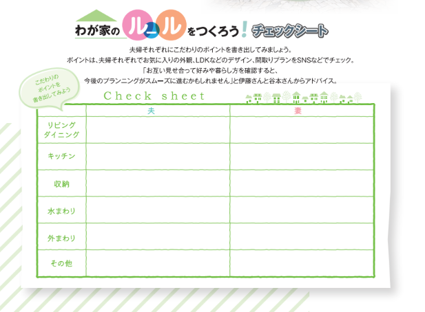 「リビングではどう過ごす?」「どんな収納があると使いやすい?」「外から帰ってきたら、どんな動線で動く?」など、暮らしに合わせた「わが家のルール」をまとめておくと、家族で「理想の住まい」のイメージを共有できます。