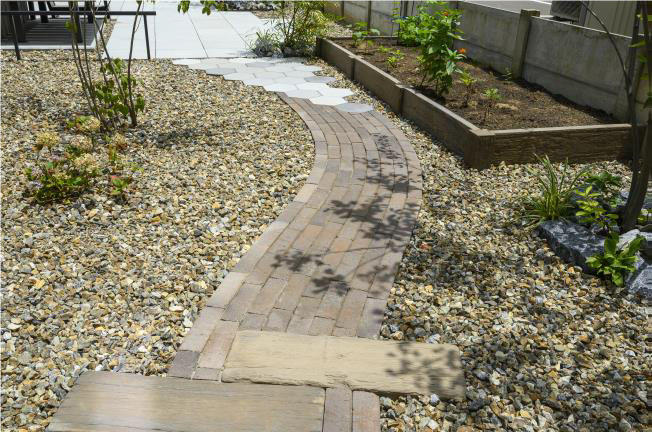 枕木、平板敷き、レンガ敷きを通って庭の奥へ導く