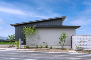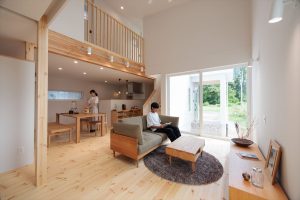 平出の家 【中庭を囲む住まい】モジュールホーム中庭を囲む間取りに加え、1階に寝室を配置した1.5階建ての住まい。 リビングは勾配天井に桐の羽目板を採用し、解放感と温かみのある空間に。 ...