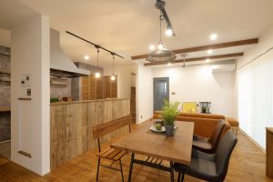 スタイルにとらわれない遊び心満載ハウスメゾンデザイン工房リビングのテレビ壁には 本物のレンガでカッコよさを演出! キッチンも折り下げ天井で 木目がオシャレなカフェのような雰囲気に ...