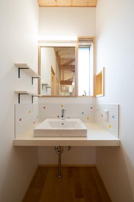 壁のモザイクタイルや造作鏡などにこだわりが。横壁をくりぬいた収納などの工夫も。