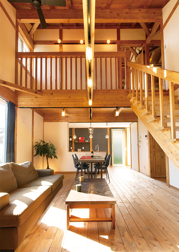 吹き抜けのあるリビングは、家族の気配を感じながらもそれぞれの時間を過ごせる設計。