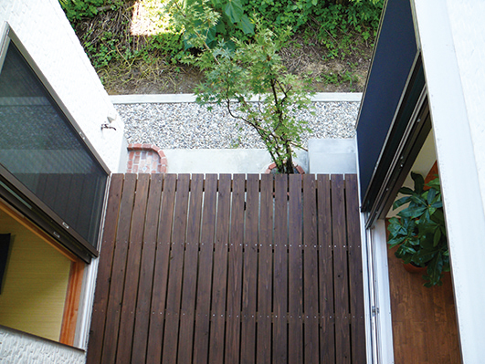 光と陰のバランスを丁寧に計算し、昼は自然光がやさしく包み、夜は照明が木の表情を引き立てます。