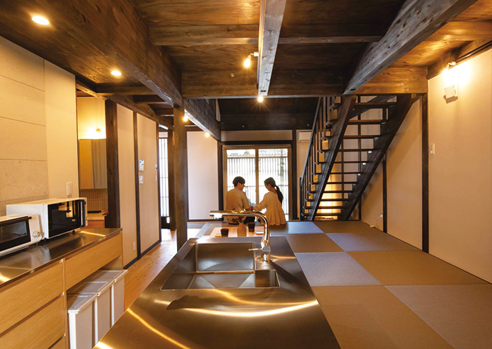 ステンレスのキッチンが空間を引き締め、無垢の床や畳の柔らかな質感が心地よい対比を生み出しています。