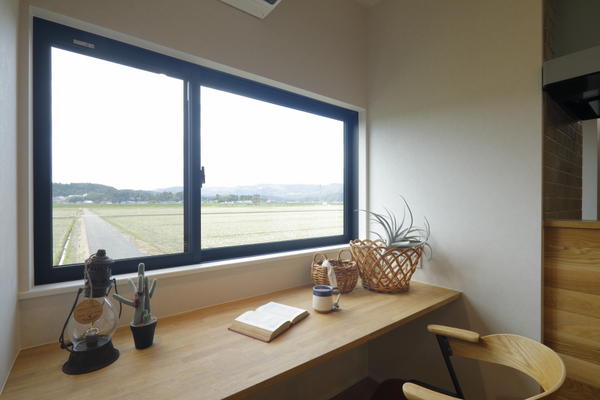 木の温もりと自然の心地よさを感じる吹き抜けのお家ができました。リビングの床とキッチンの腰壁はオーク材を使用。オークの優しい色合いとニュートラルカラーのクロス、黒のアイアンがおしゃれな雰囲気に仕上がっています。