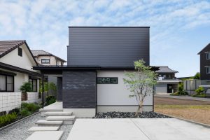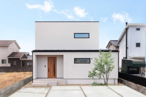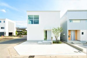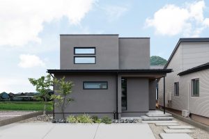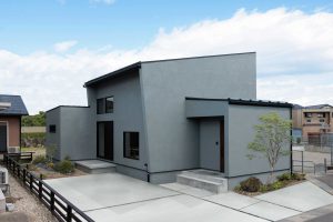 ノークホームズ|デッドスペースのないノンストレスの家。北欧モダンの暮らしノークホームズ株式会社軒ゼロの屋根でキューブを積み重ねたようなスッキリした外観と、グラフテクトキッチンや、グレーのアクセントクロスで北欧モダンな内装に。 空間や...