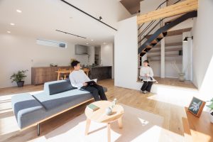 ノークホームズ|暮らしが快適になるアイデアたっぷり!開放的な吹き抜けの1.5階建てノークホームズ株式会社開放的な吹き抜けがある広々としたLDKが魅力の1.5階建て ハードメープルの床と、アクセントのグレー色で、優しく心地よい空間となりました。...