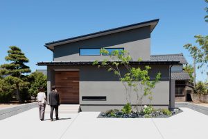 春江町中筋の家/ホテルライク、デザイン重視の家カズクリエイトオフィス数十社ものモデルハウス住宅を見て検討する中、出会った感動のデザイン。ダイナミックな勾配天井とホテルライクなLDKが特にお気に入りの空間。